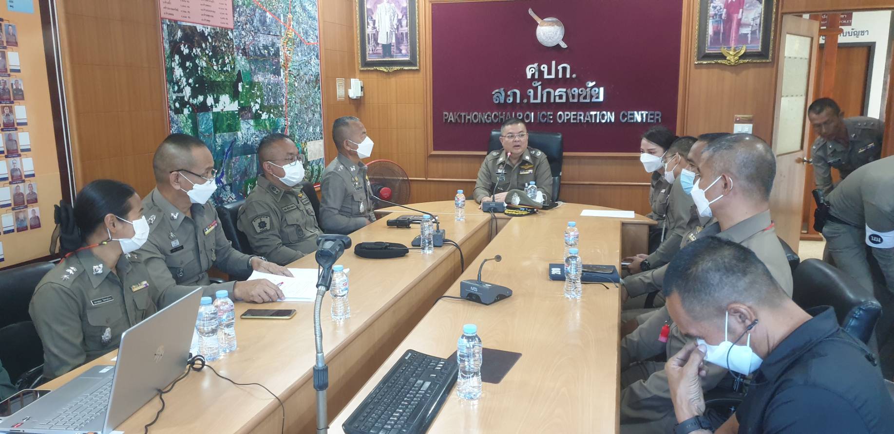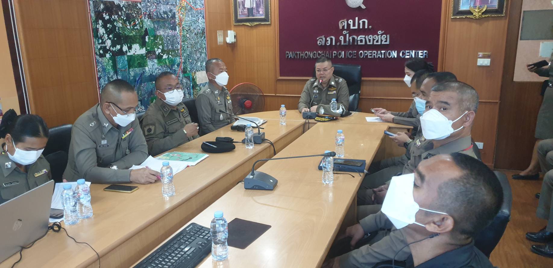 , พ.ต.ท.เอก หวังแววกลาง รอง ผกก.ป.สภ.ปักธงชัย , พ.ต.ท.สมหมาย พิศุทธิ์เศรษฐ์ศิริ รอง ผกก.สส.สภ.ปักธงชัย , พ.ต.ท.ศุภเชษฐ นวจินดาพงศ์ รอง ผกก.(สอบสวน)สภ.ปักธงชัย และ พ.ต.ท.พระ ธรรมศร สวป.สภ.ปักธงชัย ร่วมให้การต้อนรับ ทั้งนี้ได้เรียกหัวหน้างานแต่ละสายงานเข้าร่วมประชุมเพื่อรับมอบนโยบายการบริหารงานจากผู้บังคับบัญชา