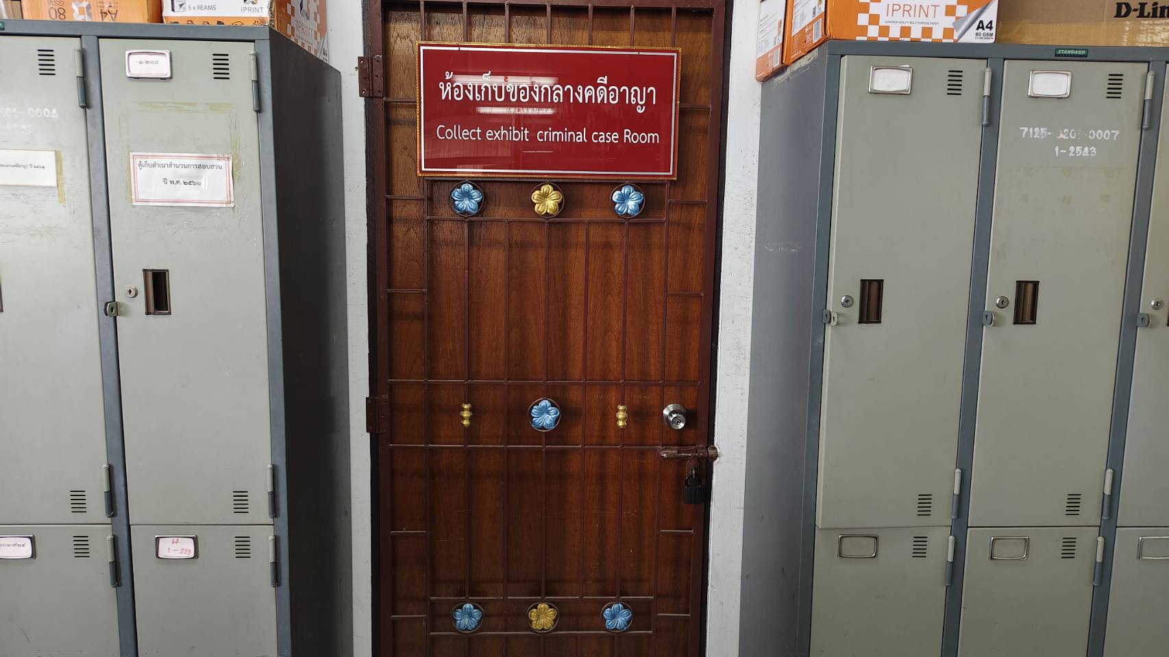 มีการจัดเก็บของกลางไว้เป็นสัดส่วน ห้องเก็บรักษามีความมั่นคงแข็งแรง มีการตรวจสอบเป็นประจำ และมีสมุดคุมของกลาง แฟ้มข้อมูลการทำลายของกลาง