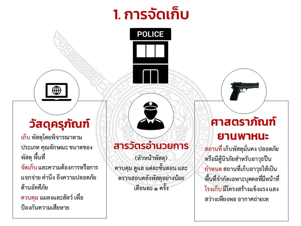 มีการตรวจสอบ อาวุธยุทธภัณฑ์ สิ่งของหลวง ของบริจาคเป็นประจำทุกเดือน มีสมุดคุมการเบิกจ่ายสิ่งของหลวง และวัสดุครุภัณฑ์ ห้องจัดเก็บอาวุธยุทธภัณฑ์มีความมั่นคงแข็งแรง แยกออกจากห้องเก็บพัสดุครุภัณฑ์อื่น