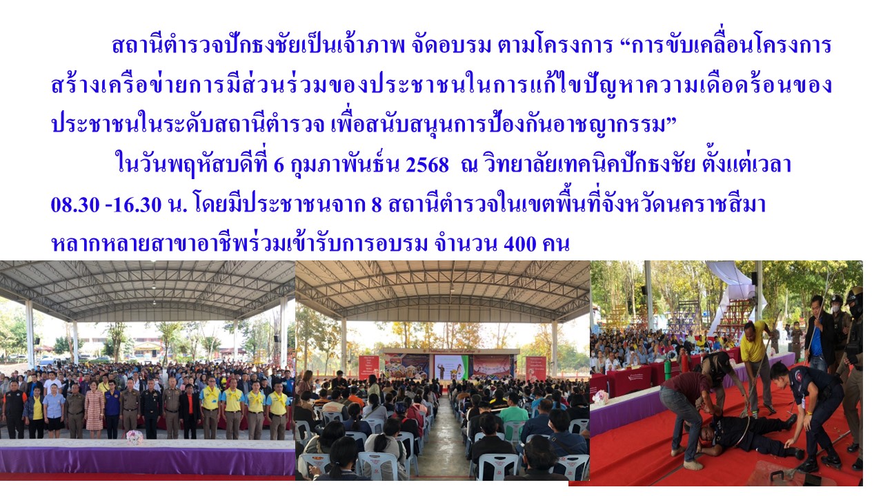 | 24 กุมภาพันธ์ 2568 ตามที่นาง วินัย ประชาชนตำบลตะขบ มาขอความช่วยเหลือที่ สภ.ปักธงชัย เนื่องจากเพื่อนบ้านเผาถ่านก่อความเดือดร้อนรำคราญและป่วยภูมิแพ้ไปขอความช่วยเหลือจากหลายหน่วยงานแล้วไม่เป็นผลล่วงเลยมาเป็นระยะเวลานานเมื่อเวลาประมาณ 10.00 น. พ.ต.ท. พระ ธรรมศร สวป.สภ.ปักธงชัย ภ.จว.นครราชสีมาพร้อมด้วยสายตรวจตำบลตะขบ ผู้ใหญ่บ้านหมู่ 7 ตำบลตะขบได้เรียกคู่กรณีมารับฟังข้อกฎหมายเรื่องพ.ร.บ.เก็บหาของป่าว่าด้วยการทำถ่านและขายถ่าน กฎหมายละเมิด และกฎหมายเกี่ยวกับที่ดิน สปก.ต้นไม้ในที่ดิน สปก. ทั้ง 2 ฝ่ายฟังจนจบ 1) ผู้ก่อเหตุเลิกไม่เผาถ่านอีกต่อไป จนกว่าจะไปทำเรื่องที่ สทจ.นครราชสีมา 2) ผู้เดือดร้อน พอใจ 3) ผู้ใหญ่บ้านและผู้นำชุมชนเข้าใจกฎหมายและหลักปฏิบัติที่เกี่ยวข้อง และวิธีแก้ไขปัญหาแบบเดียวกันต่อไป |